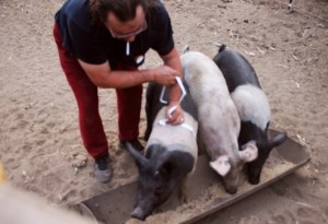 Here is a shot of my sweetie measuring Miss Piggy with a hog weigh tape. This photo gives you some sense of scale.