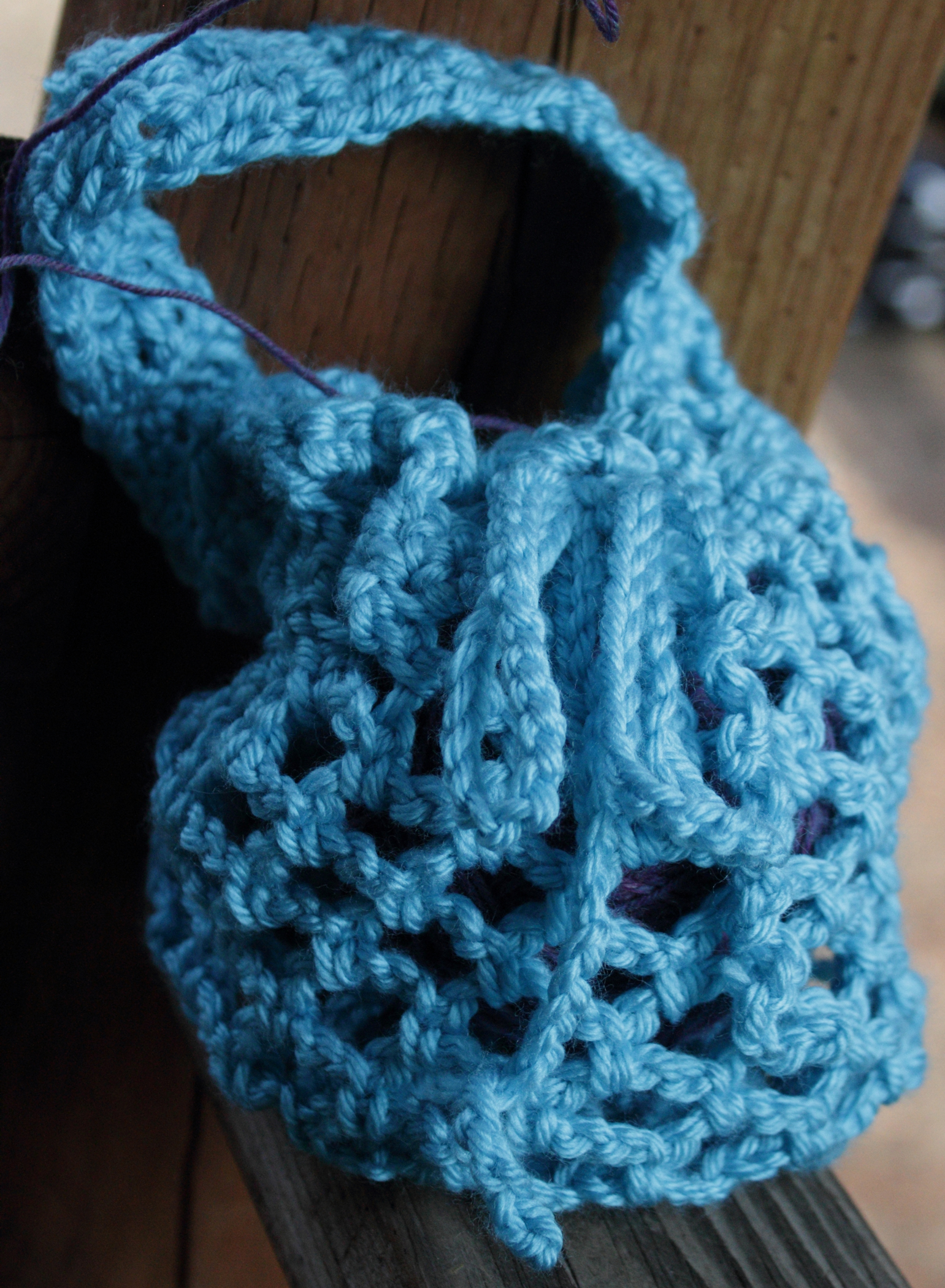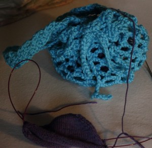 I don’t remember what kind of yarn I used. I bought it at Walmart and it was the only turquoise yarn they had. Of course, I threw away the ball band. (I really have to stop doing that!!!) But, it’s a bit chunkier than typical Red Heart Super Saver. The yarn is acrylic, but it is super soft. I used a size J hook.