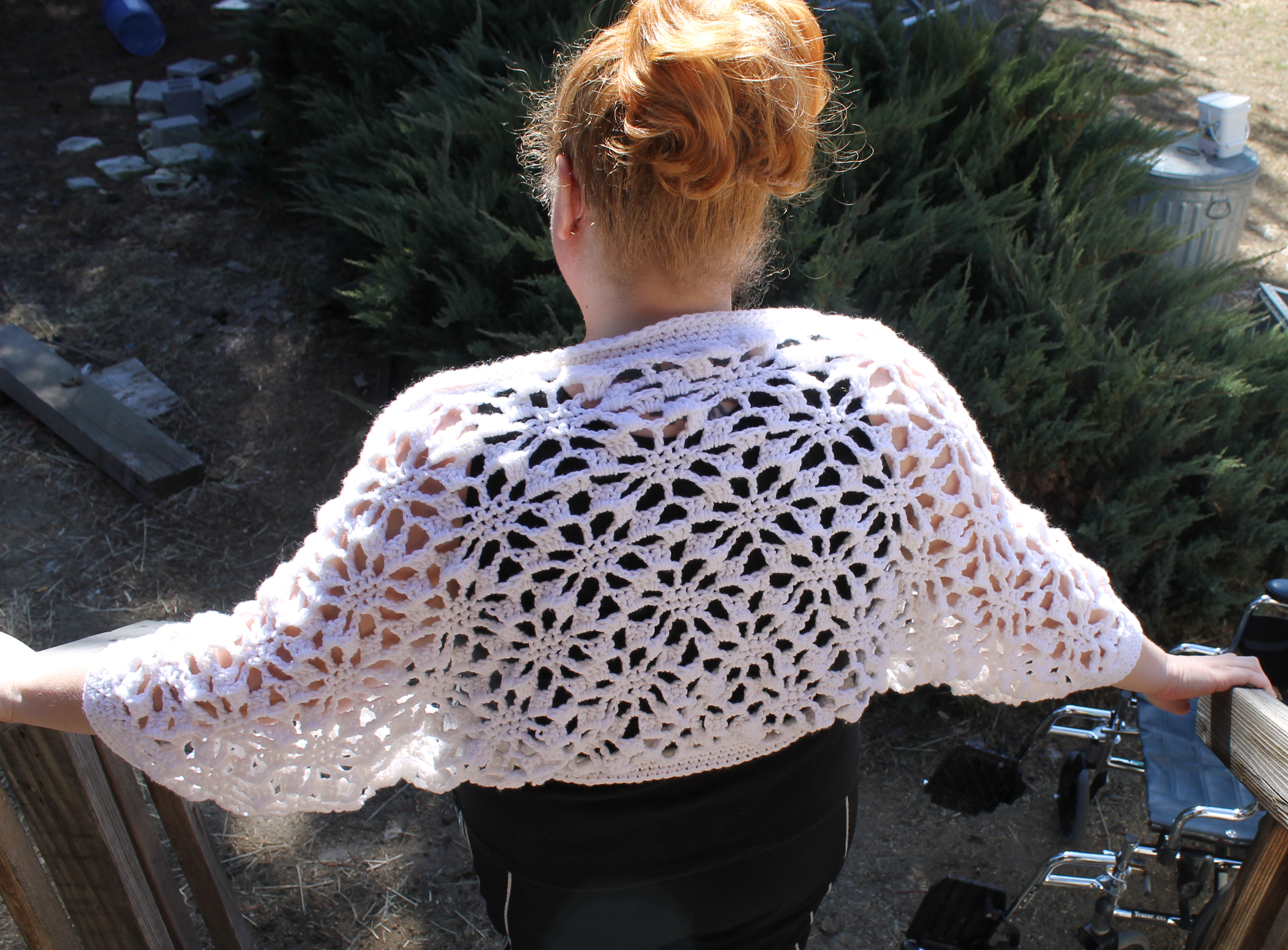 Next up, I made this shrug… I needed a cover-up to wear over tank tops at work (tanks aren’t allowed to be uncovered) and I was tired of wearing the same old, plain cardigans. I designed this simple shrug myself. The only pattern I used was this stitch pattern: My Picot #2049.