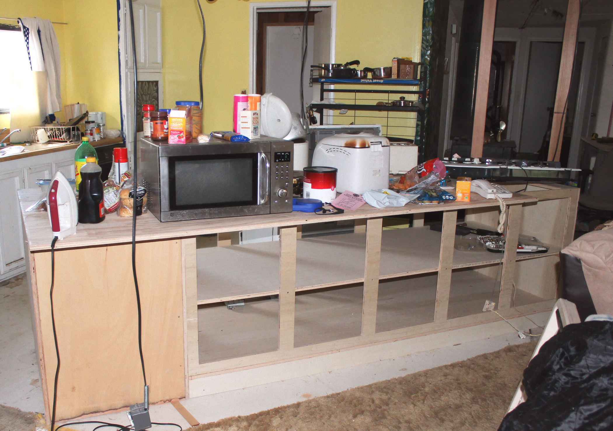 My dad got the island shell finished and we got it into the kitchen. Here’s a picture. Please excuse the mess, we don’t have anyplace to put anything at the moment.