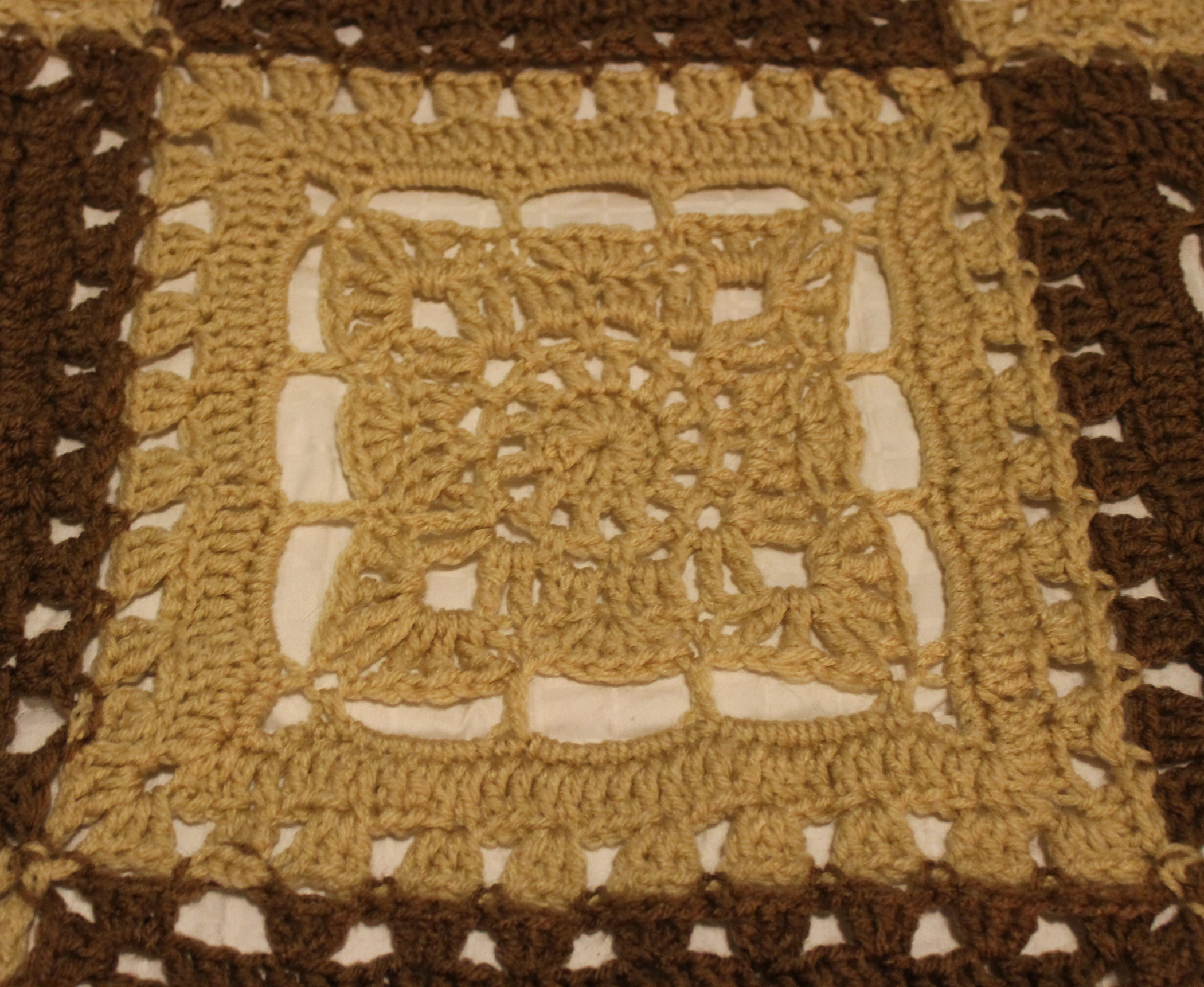 It’s the perfect size for me to use on the couch. Sorry I didn’t get any pictures that show the size, but after putting it through the washer and dryer to block, the squares are 10 inches. I used Red Heart Super Saver yarn in the colorways Buff and Cafe Latte. It is soft, squishy and oh-so comfy! Acrylic yarn really has come a long way since I first learned to crochet in the 80’s!