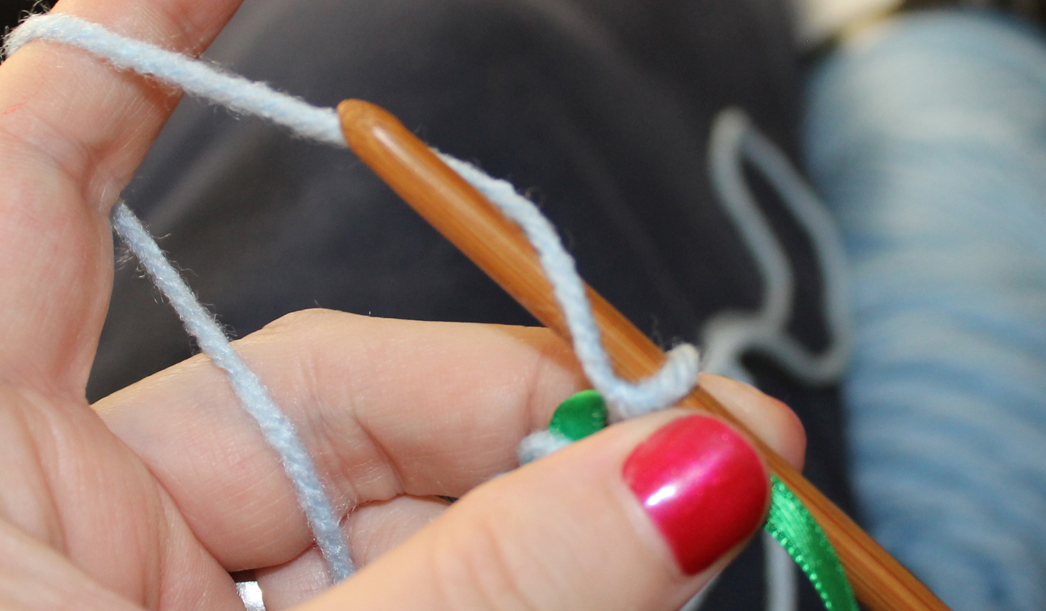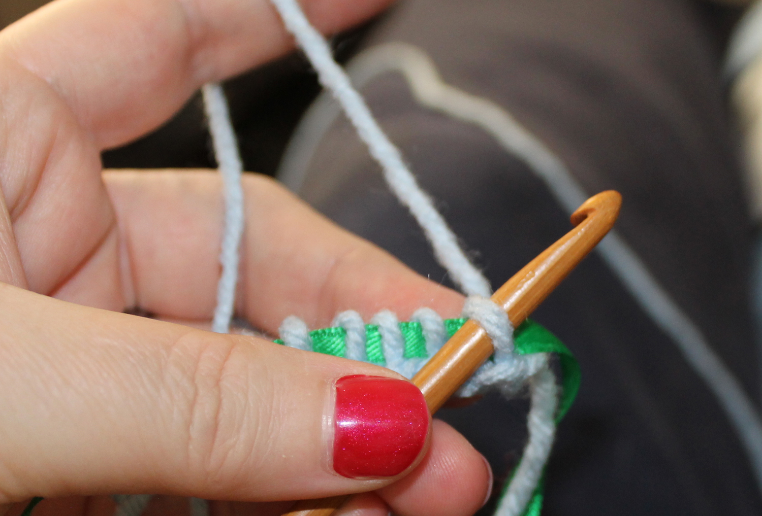 Getting started: cast on (crochet chain) desired number of stitches, then pick up stitches (working right to left, pull loop through each chain stitch, leaving each loop on the hook). Slide stitches off of hook and onto cord. Turn your work so that the hook is on the right and you’re working right to left, just like in crochet.