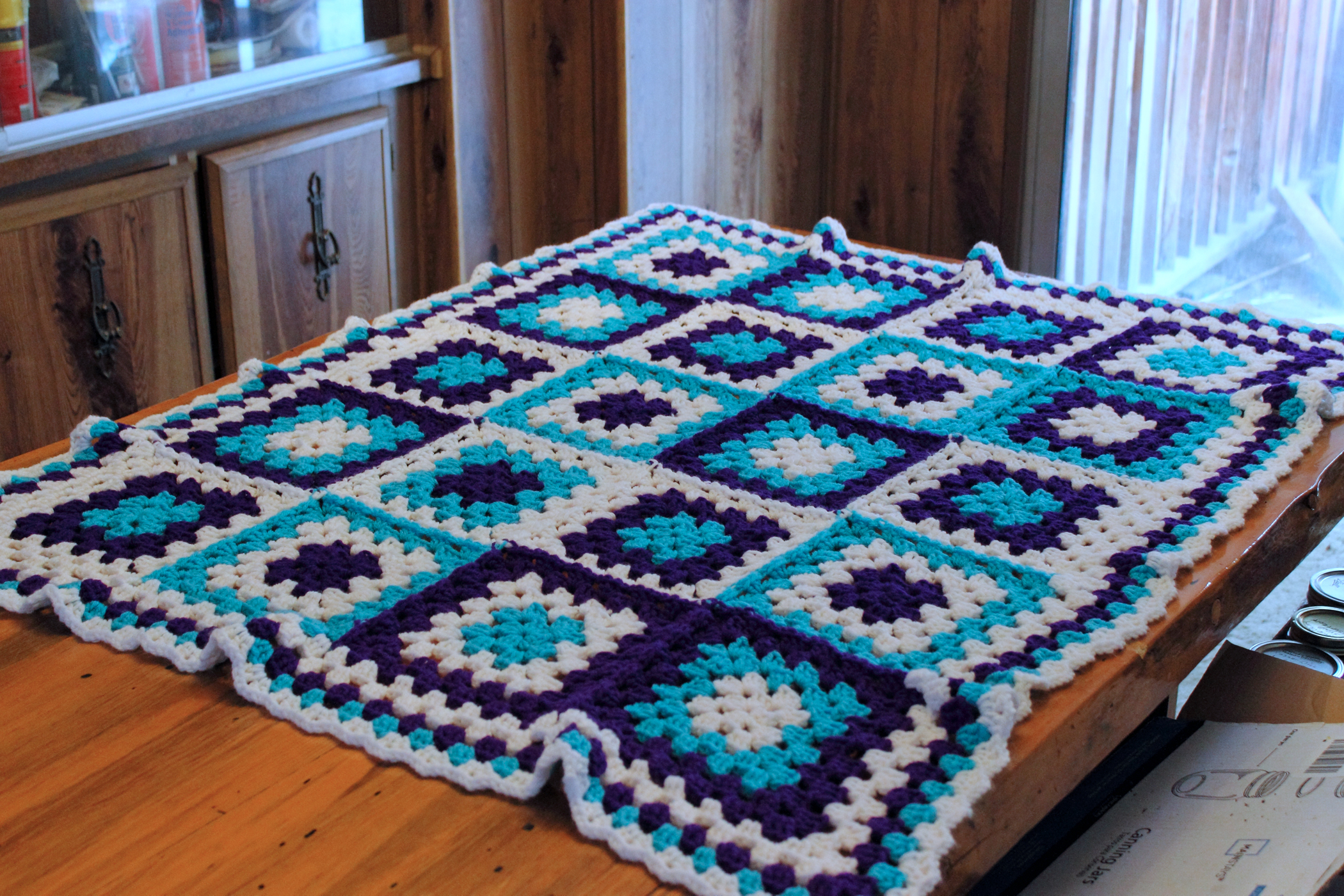 First of all, I have to apologize for the colors in these photos. The colors I used are purple, turquoise and white. However, it was snowing and I had a heck of a time getting adequate lighting. Of course, I’m impatient and wasn’t going to wait another day to take pictures. I’m actually impressed that you aren’t seeing horrible photos that were taken in incandescent light – I finished the blanket the night before.