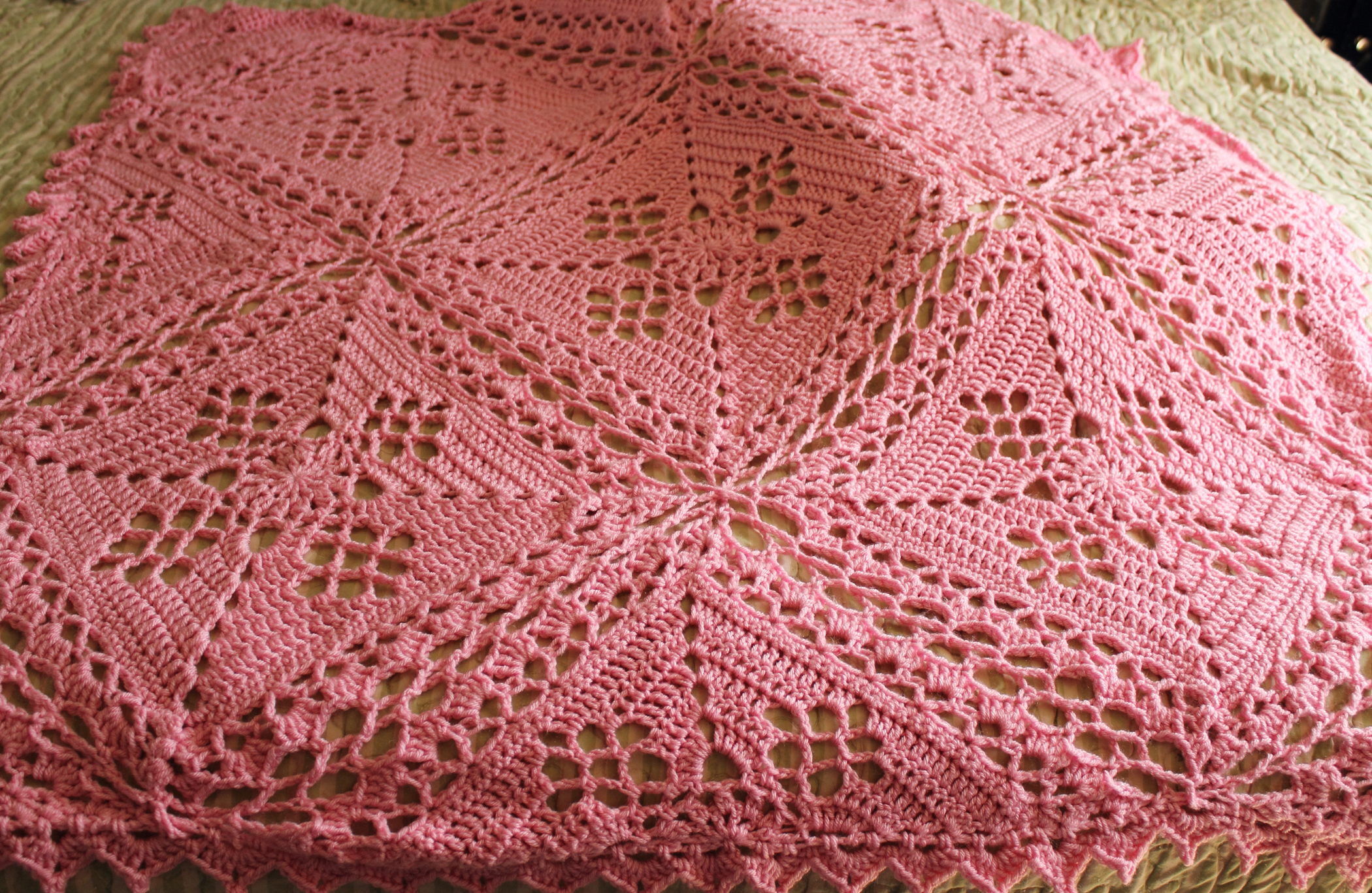 It is 43-inches square. The blanket was crocheted using a 5.5mm hook with Hobby Lobby’s I Love This Yarn! in the Pink colorway. It took 3 skeins of yarn.